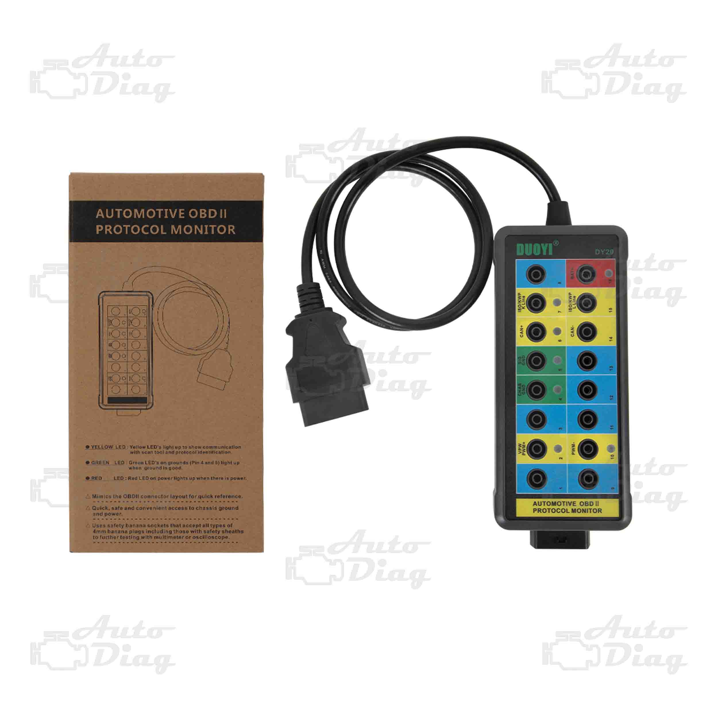 El Break Out Box es una herramienta automotriz para el conector de enlace de diagnóstico OBDII que ofrece monitorear señales de protocolo, energía y tierra de manera conveniente y segura. También se puede conectar a un multímetro u osciloscopio para realizar pruebas adicionales una vez que se detecten señales no confirmadas.